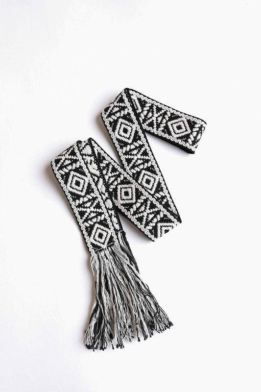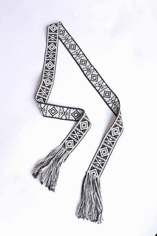Add a touch of fun to your outfit with the Kristi Aztec Tie Belt! The Aztec pattern and frayed trim give this belt a laid-back boho look. Stand out from the crowd and tie together any outfit with this playful accessory. (Note: It may cause belt envy in others!)