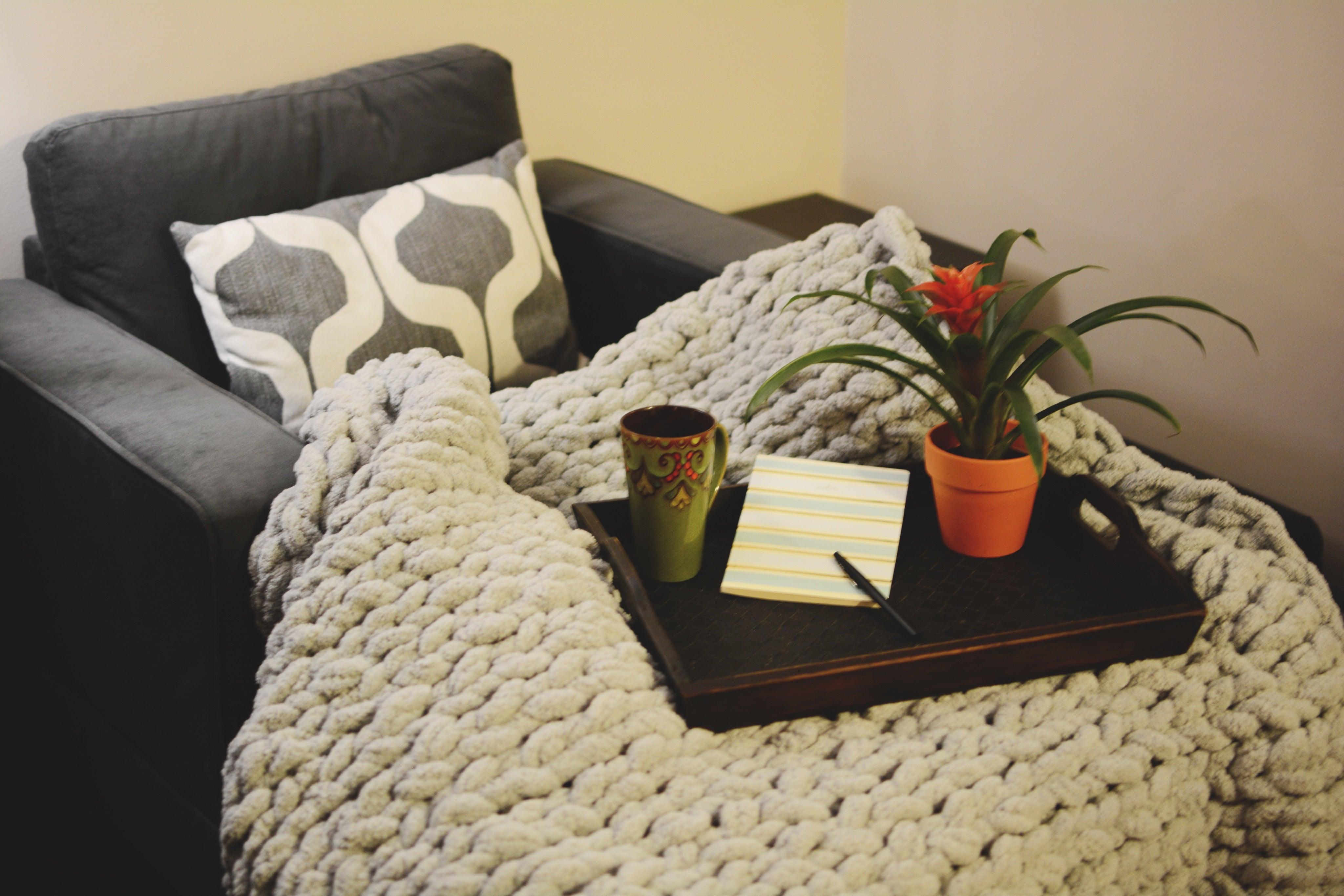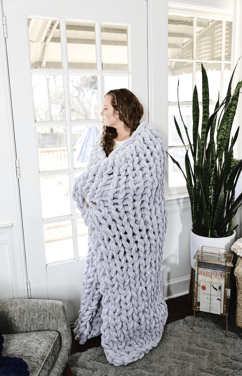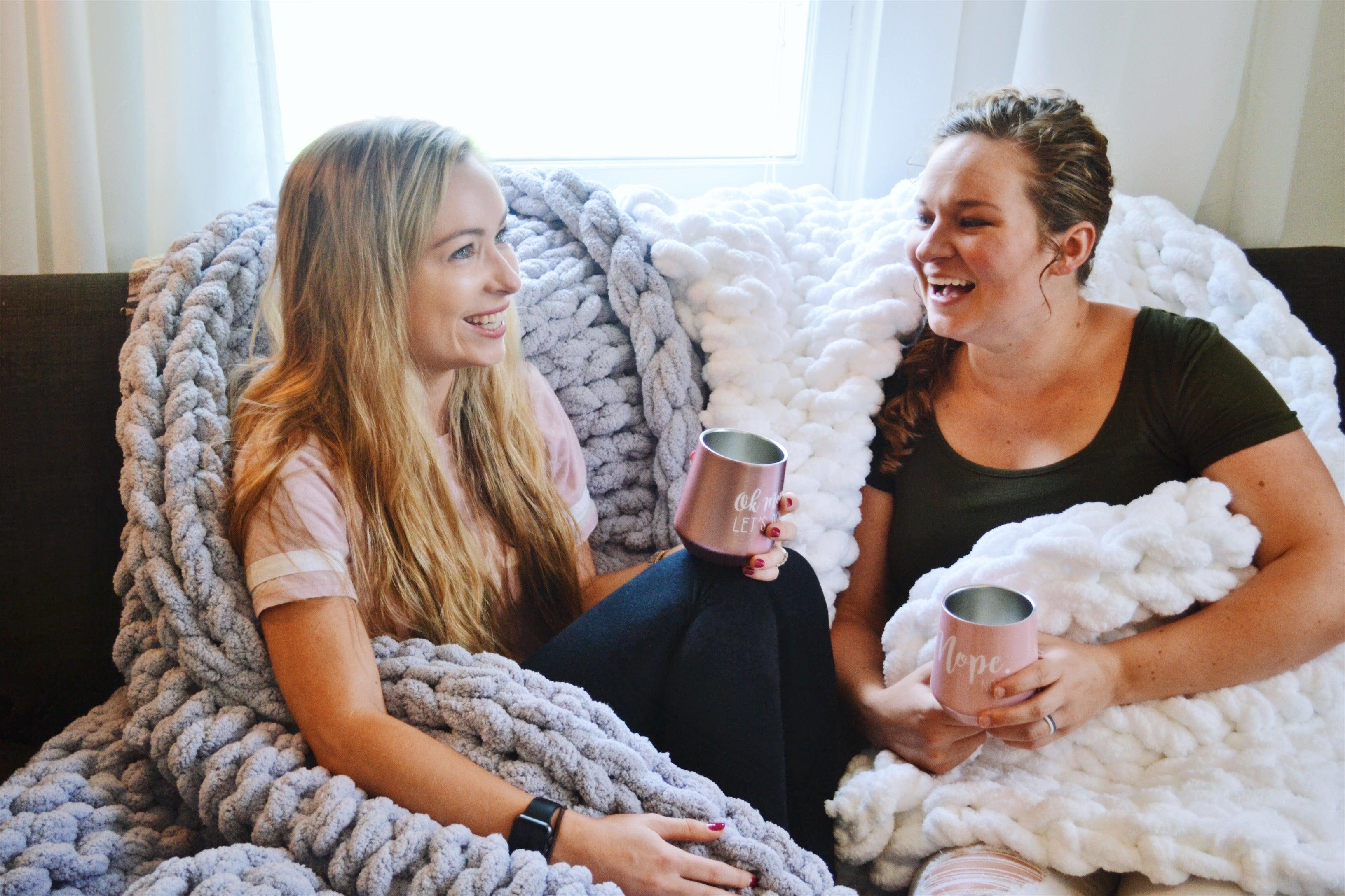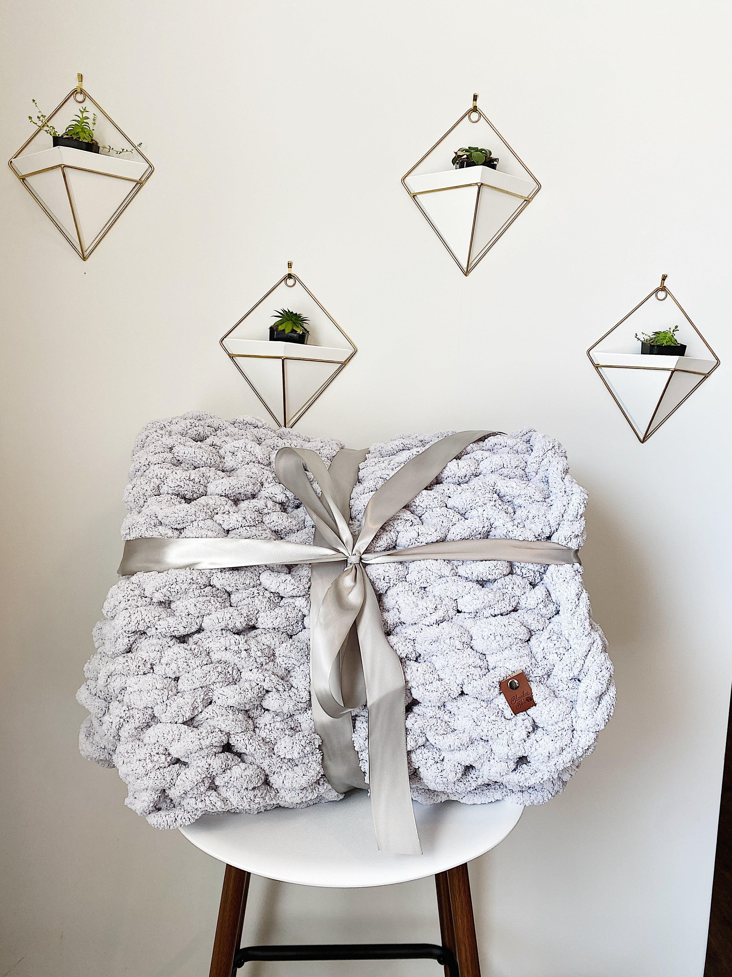 This oversized chunky-knit blanket is perfect for wrapping yourself up in or draping across your couch or bed! Each blanket is double hand-knit in TN and is made using incredibly soft chunky chenille yarn.