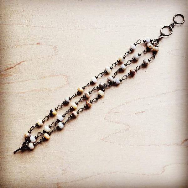 Strands of genuine agate stones make up this triple strand bracelet. Bracelet measures 7.5" in length end to end. Adjustable to two wrist sizes. Although your item will resemble the photo no two are identical