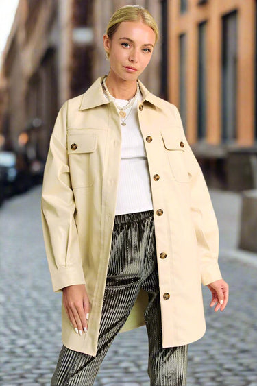 The Faux Leather Button Up Jacket with Chest Pockets is a stylish and edgy addition to your outerwear collection. Crafted from faux leather, this jacket offers a sleek and sophisticated look. The button-up front and chest pockets add a touch of utility and functionality to the design. Perfect for adding a trendy vibe to your outfit, this jacket can be paired with jeans or dresses for a chic and versatile ensemble. Elevate your style with the Faux Leather Button Up Jacket with Chest Pockets for a fashionable and on-trend look.