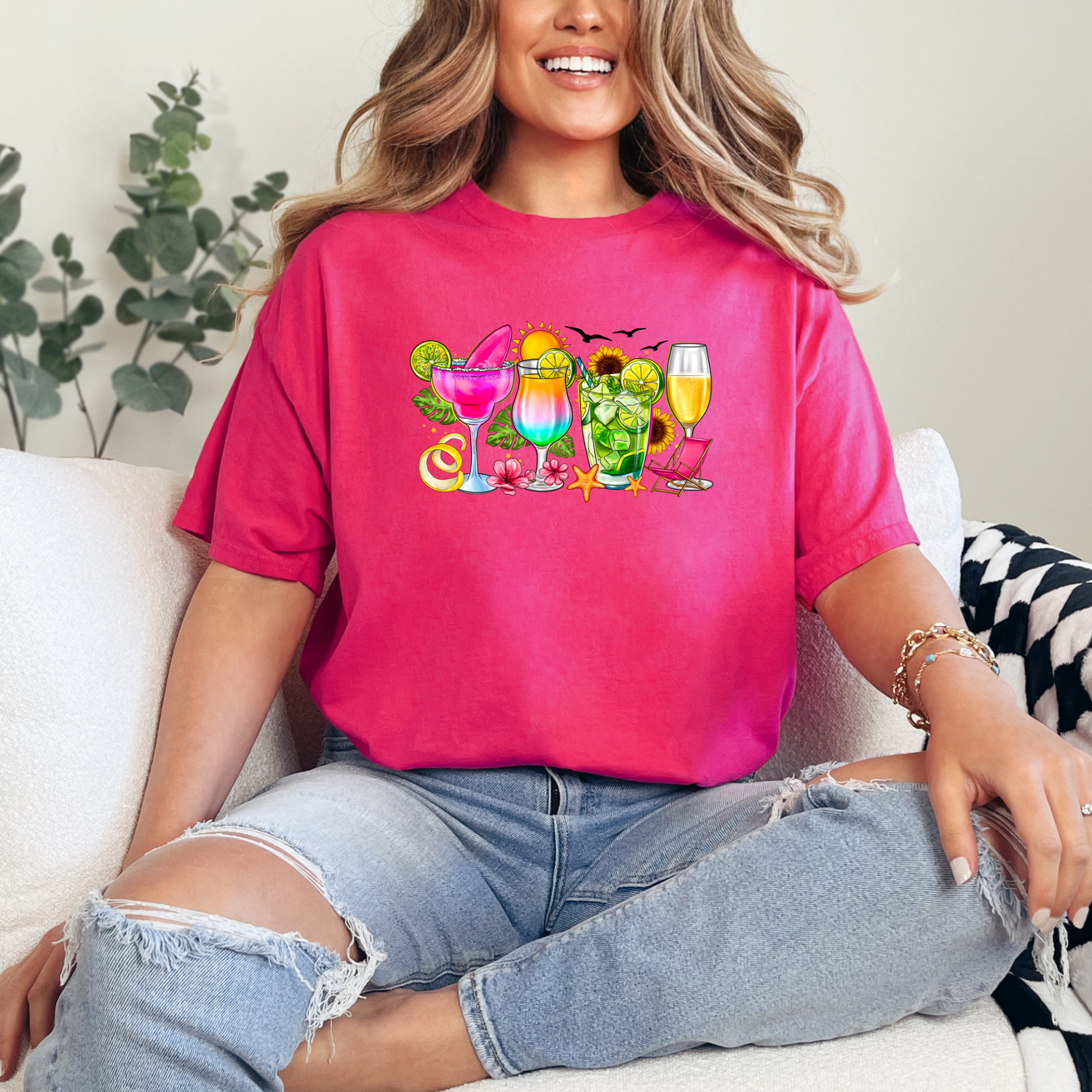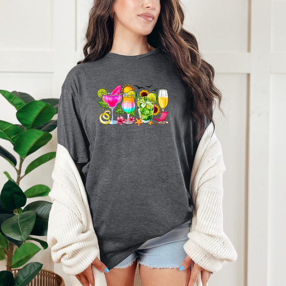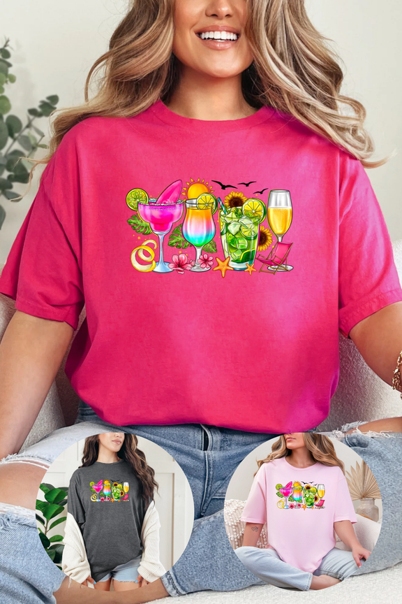 Sip into summer with the Summer Cocktails graphic tee! Bursting with vibrant colors and fun vibes, this playful shirt is perfect for pool parties, beach days, or just lounging with your favorite drink in hand. Celebrate sunny days and good times in style!