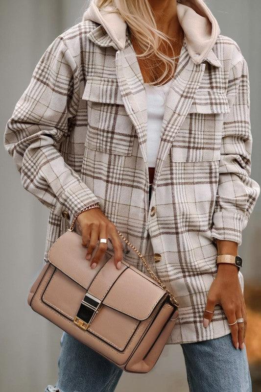 Stay cozy and stylish with our Plaid Removable Hood Buttoned Shacket. This versatile piece features a removable hood and buttoned design, adding a quirky twist to your wardrobe. Keep warm and stand out from the crowd in this playful shacket. (Double the fun with a removable hood and buttoned details!